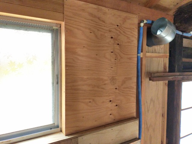 この面に仕上げ材のキッチンパネルを貼れたら、レンジフードの固定ができる。